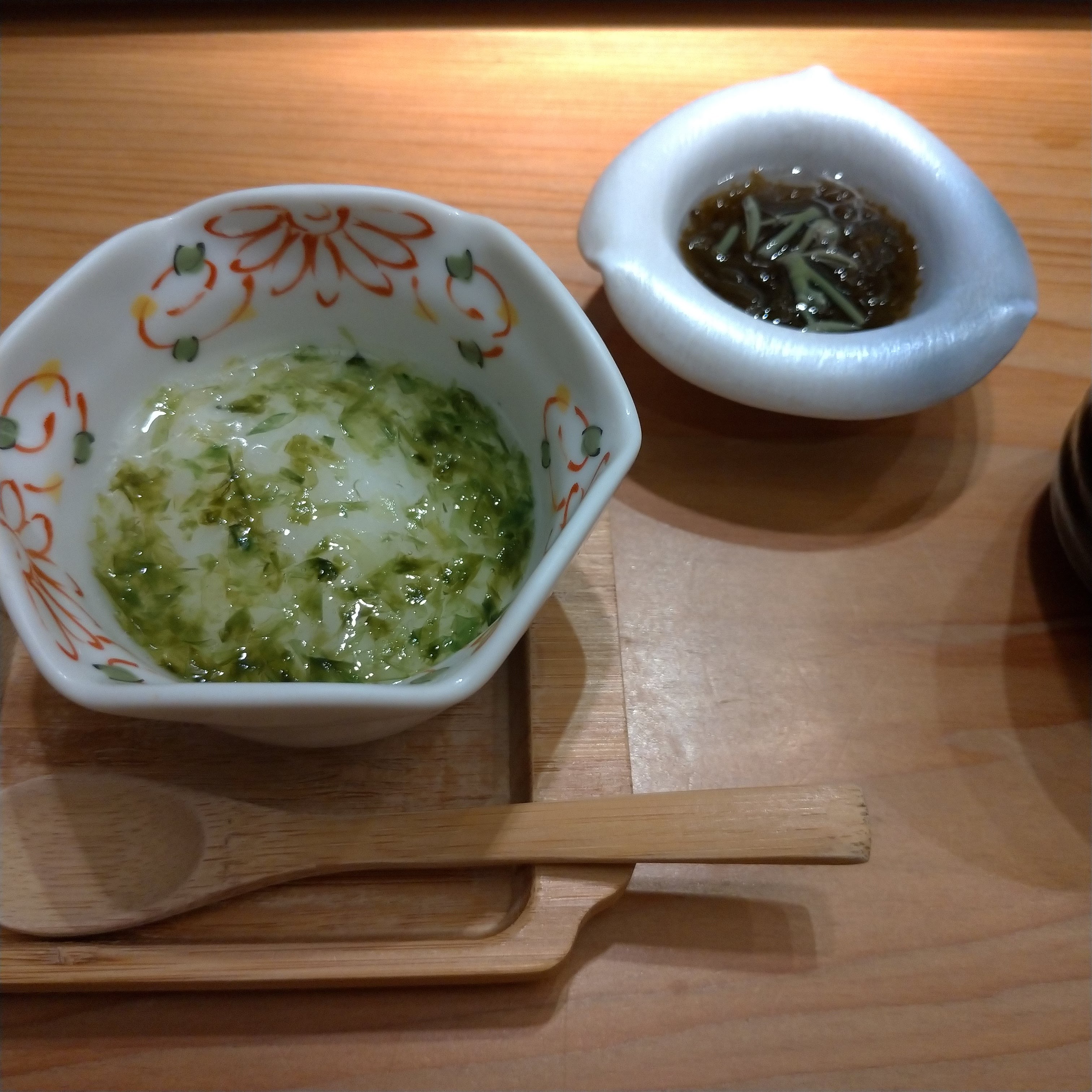 師父說接下來就是一連串的生食,所以這一道是先讓我們暖暖胃,黏黏稠稠的 搭配海藻、新鮮魚肉的甘美很清淡很舒服感覺非常適合生病的時候吃,然後就開始一連串的生食啦。
