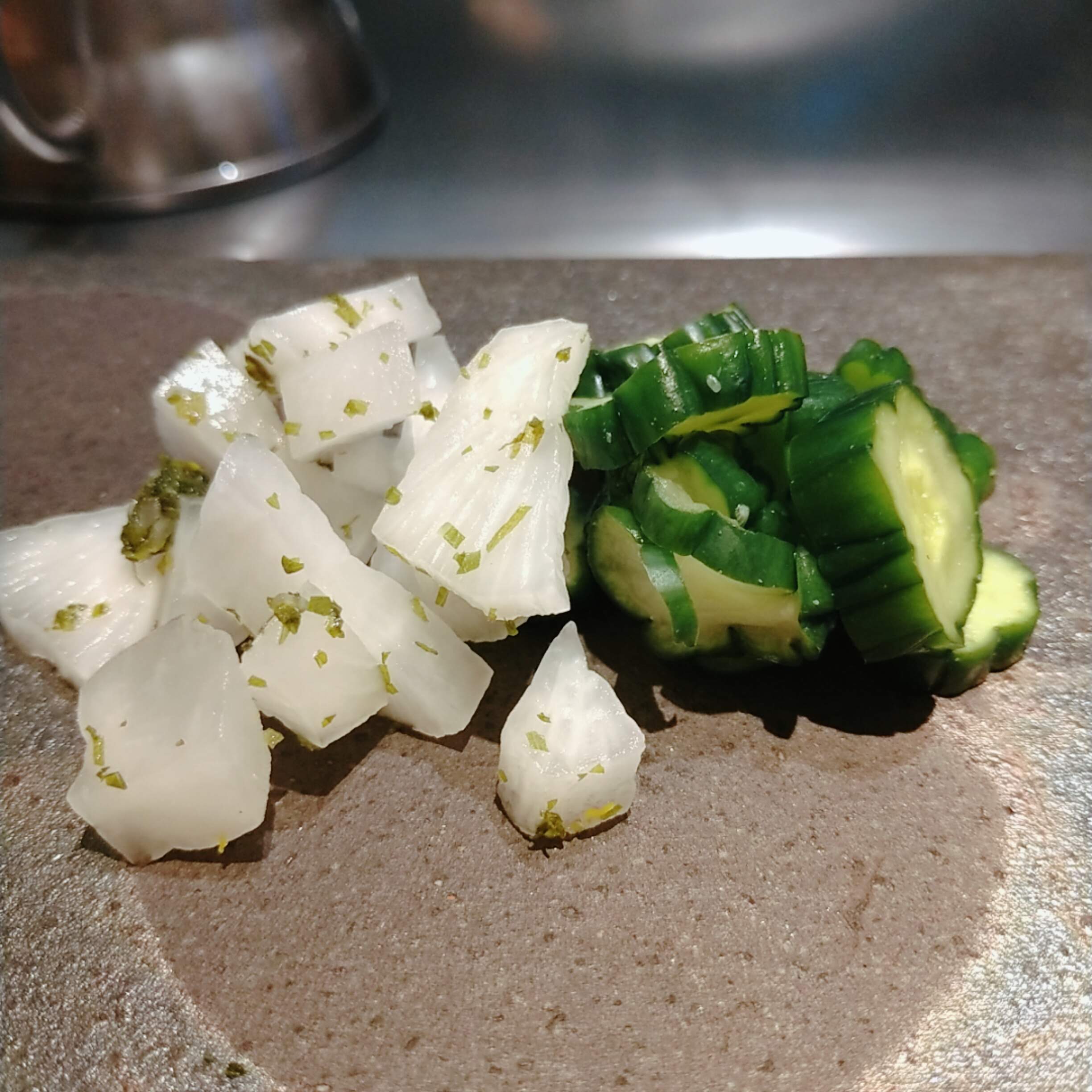 和上一次一樣 白蘿蔔加了些紫蘇調味,小黃瓜這次比較清爽順口 酸酸甜甜,又開胃又可以清爽淡化上一道菜剩下的味道 讓人一口接一口。