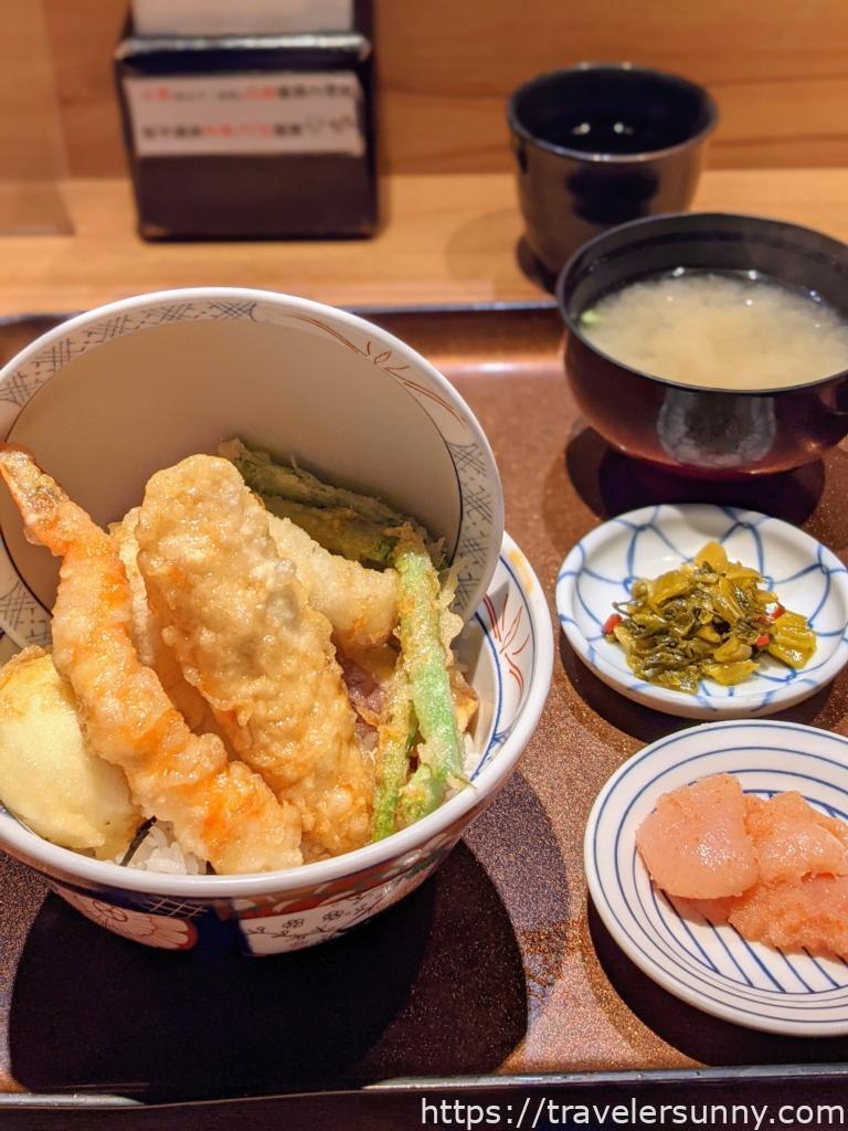 不喜歡吃白飯的人推薦點天丼系列,白飯吸滿天婦羅的醬汁,甜甜鹹鹹好下飯。然後續第二碗可以好好品嘗明太子和高菜的口感。