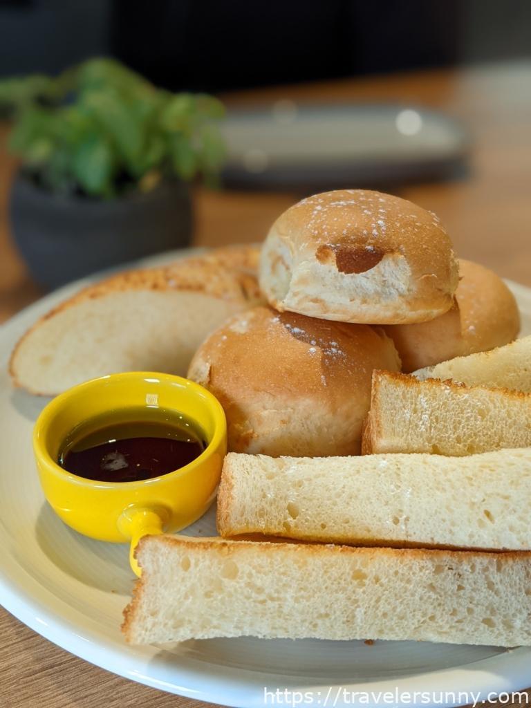 首先登場的是綜合麵包拼盤,當天的選手有奶油餐包、起司麵包、牛奶吐司搭配油醋醬。奶油餐包裡面包裹著整塊奶油,甜甜的有點像是餐後甜點的感覺。起司麵包單吃就有濃厚的起司香氣;牛奶吐司口感香甜酥脆, 每一款都很好吃,唯一的缺點是份量實在是太多了,吃完麵包的話正餐都吃不下了(笑