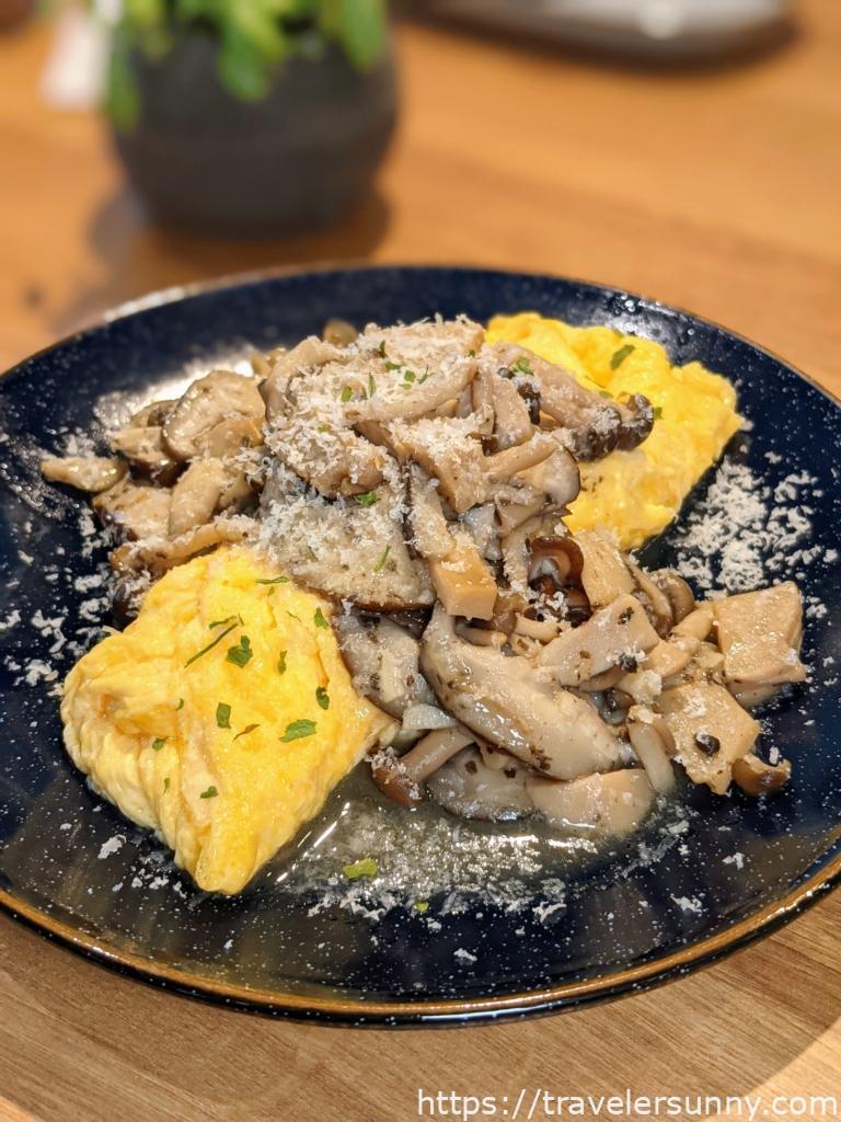 軟嫩多汁的歐姆蛋上堆疊炒過的野菇們,一上桌就香味四溢,最上層撒上起司粉,讓人忍不住一口接著一口,也可以放在麵包上食用,吸附湯汁的麵包體變得更加美味,五辛素的朋友也可以食用的一道餐點。