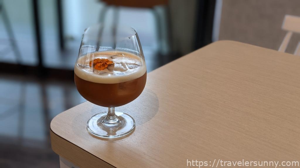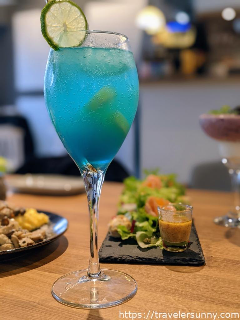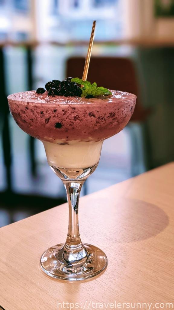 這杯是友人點的網美最愛熱帶島嶼氣泡飲,真的頗有再熱帶小島度假清爽的感覺。用的是調酒常見的藍柑橘糖漿加入蘇打水和一些熱帶水果調製而成,帶有檸檬的酸、鳳梨的香、柑橘的甜。不過因為藍柑橘糖漿的關係,甜度較高,不喜甜的人要記得跳過。