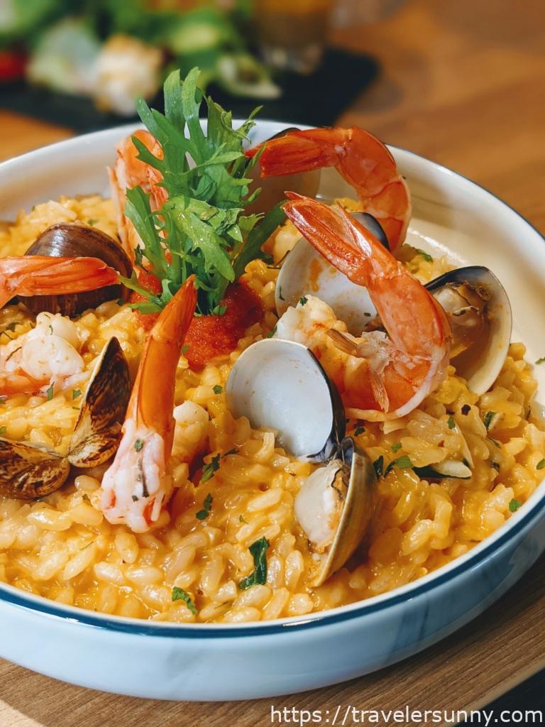 一上桌就引來大家驚呼的燉飯海鮮三重奏,鮮蝦與蛤蠣排排站好,吃得到新鮮的海味,中間明太子提供燉飯鹹味,米心屬傳統偏硬的口感。最喜歡蝦子都已幫忙將沙背和殼處理完畢,適合不喜歡剝蝦的懶人桑妮。今天同行友人兩位都一致認為這是今天最美味的一道。