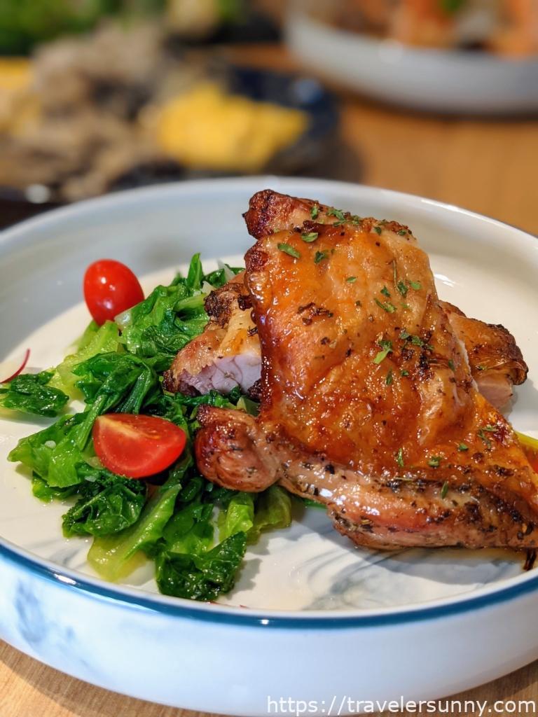 這道餐點一上菜的時候桑妮忍不住笑了,和過去的鮮嫩多汁雞腿有一些些不同,下方的菜類竟然是用炒的,但這不代表不好吃喔,只是有點出乎意料。實際食用後雞腿肉外皮一樣脆口,肉本身JUICE多汁,帶有淡淡的香料味,單吃也不膩口。
