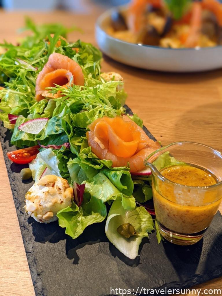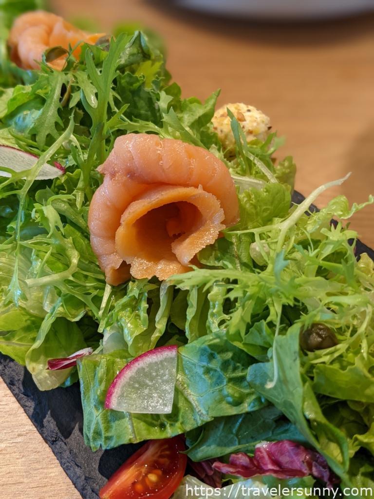 軟嫩肥美色彩嬌豔的煙燻鮭魚像是花圃中的美麗綻放的玫瑰花型態,無疑是這道菜中最顯眼的主角。本身帶有鹹香煙燻味,直接搭配生菜食用也沒問題。濃厚起司球大小適中,像是另外一品種的花朵,和燻鮭魚相輔相成,即使不沾沙拉醬也很美味。一旁的沙拉醬則有轉換口味的作用,酸酸甜甜化龍點睛,一菜多吃讓這道沙拉的口感再加分。