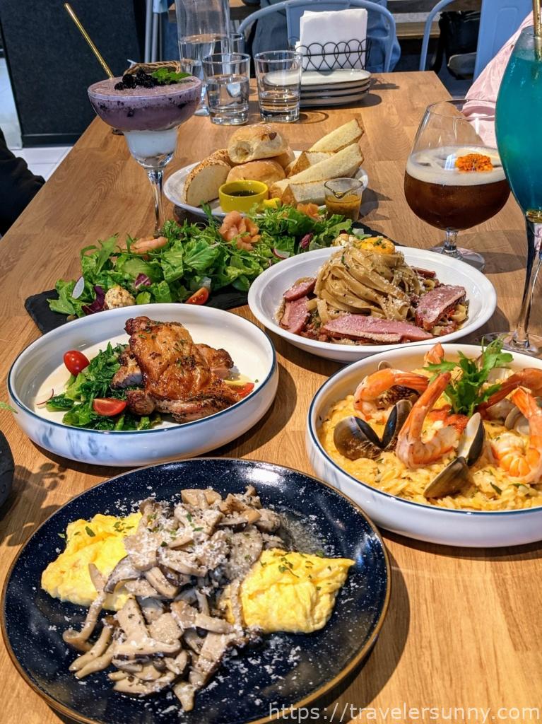 這就是我們今天所有的餐點啦,比較晚用餐,就早午餐一起吃飽飽吧。我們今天點的是閒情兩人早午套餐+單點的燉飯海鮮三重奏和鳥巢寬麵巴薩醋嗆辣鴨胸。