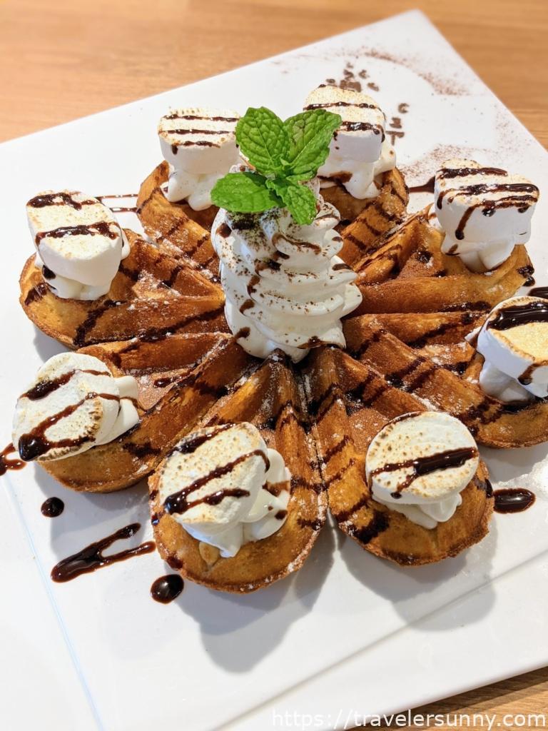 人們都說女人有兩個胃一個裝鹹食一個裝甜食,桑妮就是這樣。其實早就飽到不像話,但看到這像朵可愛小花的鬆餅,那誘人的鮮奶油以及最上方的棉花糖,忍不住又多吃了兩個。