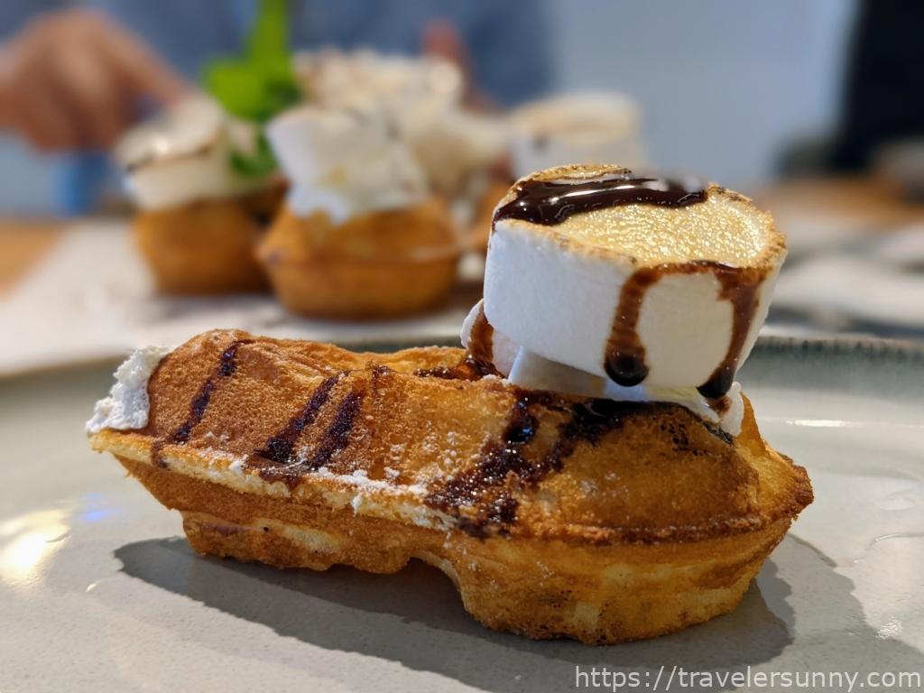 鬆餅外皮帶有點脆脆的口感,入口後又有QQ的麻糬,原以為棉花糖會很甜,沒想到整體甜度有調整,是剛剛好的甜味,鬆餅粉也是樂野食獨家特調,別處吃不到,一頓飯的最後一定要有甜食來做個完美的結尾,感謝巧克力鬆餅讓我們今天也是如此幸福(誤