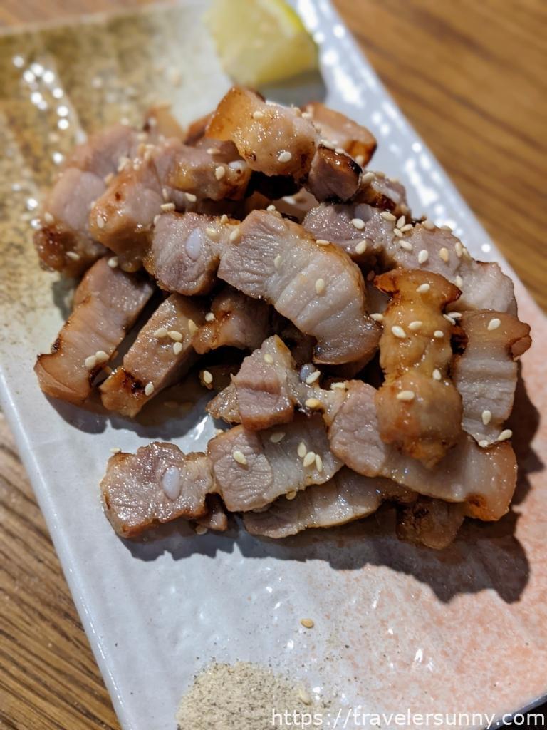 其實上一次內用的時候也有點串燒豬舌,不過那天一上桌就太開心地開吃完全忘記拍照。上一次是我第一次在串燒店吃豬舌,跟一般燒烤吃到的大多是牛舌相比便宜許多,畢竟台灣比較少養牛。牛舌通常也都切得比較薄片,喜歡吃牛舌的人推薦直接上網購買整條牛舌,會比在燒烤店吃的便宜許多喔。回想以前在澳洲的時候,牛舌可是超便宜的,畢竟外國人都不吃嘛!豬舌和牛舌相比可就豪邁地厚了許多,入口後那有嚼勁的口感,沒有多餘的腥臭味,其實不知道的人應該不會知道是在吃豬舌。好吃,必點(・ω・)b