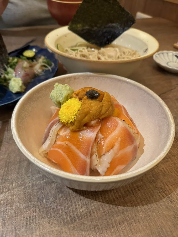 這碗是友人點的,裡面有海膽、鮭魚腹、炙燒比目魚,海膽上方還放了一坨松露醬,個人吃了兩口,覺得松露醬會蓋過海膽的甜味,比較喜歡海膽和鮭魚的搭配,不過友人是覺得怎麼樣吃都喜歡的,所以是比較見仁見智的一品喔。