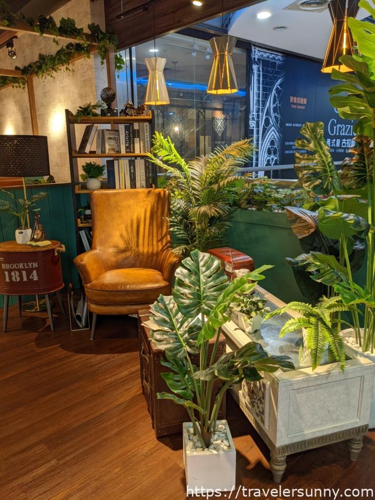 深色木質調搭配大量綠色植物裝飾,在都市水泥建築物中帶來一絲綠意放鬆緊繃的心情。