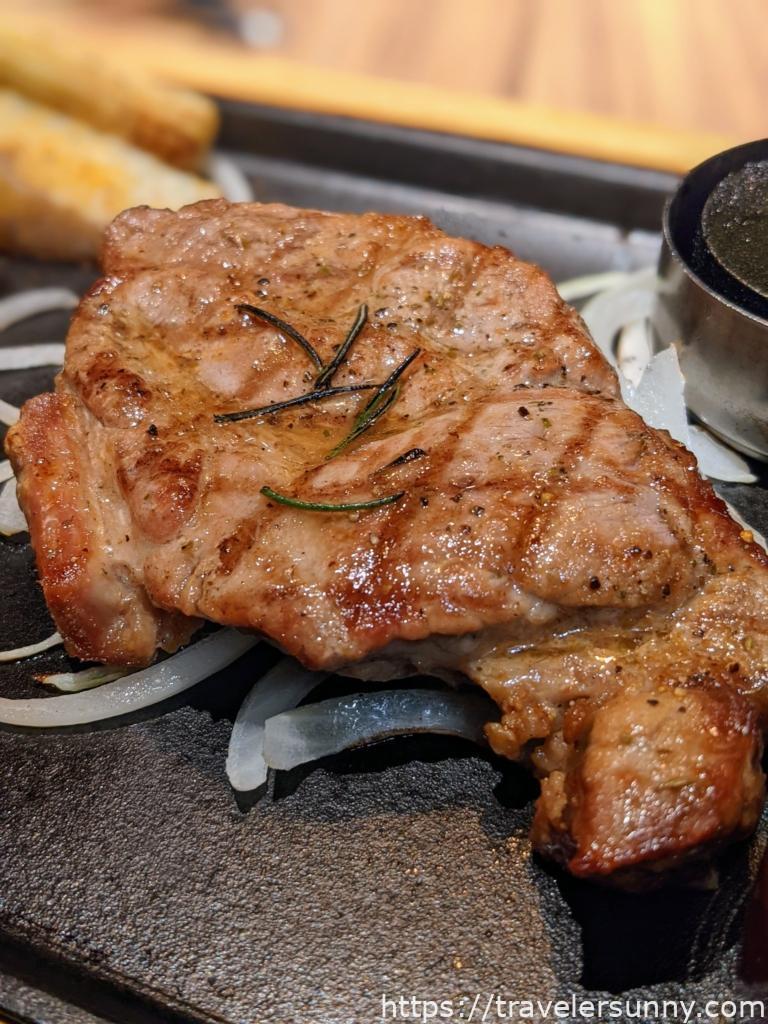 桑妮自己點的炙燒豬排,豬排的話上桌時就已經是全熟,不過一樣會附上磁石給客人加熱使用。豬排肉質非常的軟嫩,完全沒有豬肉排較硬的口感;事前先處理過入味,入口後滿滿迷迭香和香草的香氣在口中綻放,不吃牛的人桑妮非常推薦這道,好吃。