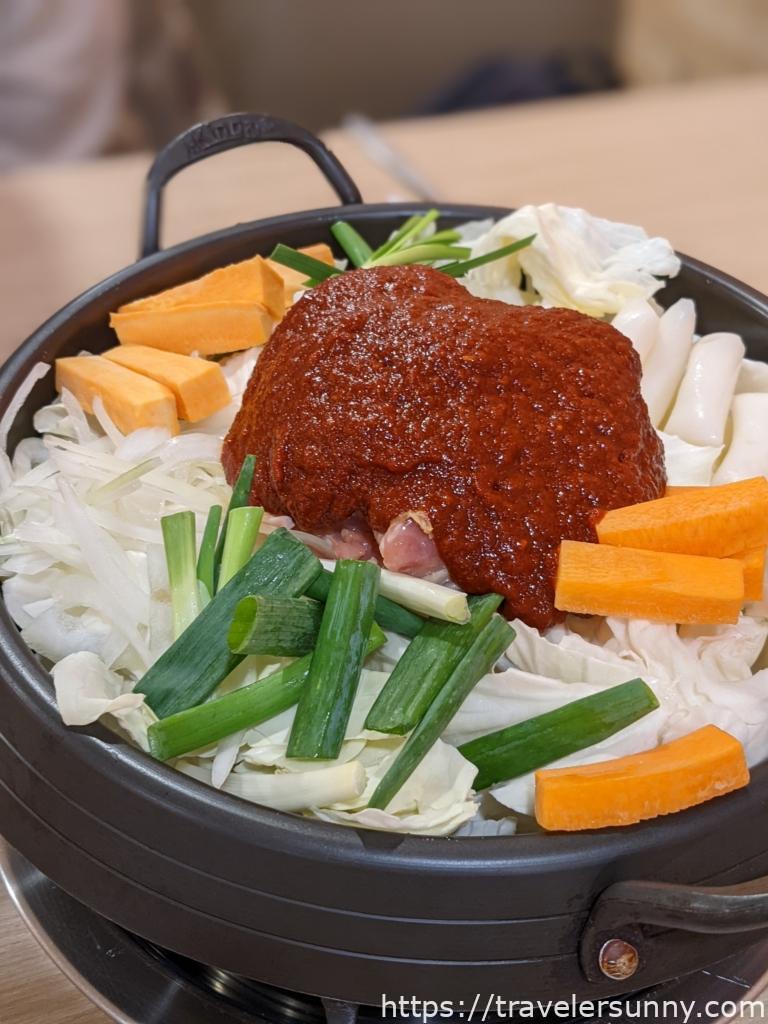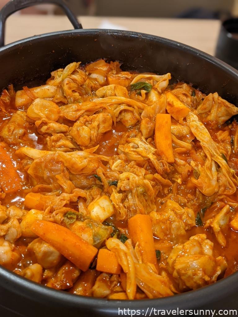 造訪這麼多次,終於吃到春川辣雞了。內容物有高麗菜、蔥、洋蔥、韭菜、地瓜、年糕、紅蘿蔔、雞肉。辣度可調整,如果不吃辣的人也可以請店家製作不辣口味。一上桌是生食的狀態,會用桌上的小瓦斯爐現場煮熟,料理過程中,服務人員會來協助拌炒,讓調味醬能均勻攪和好食材。
