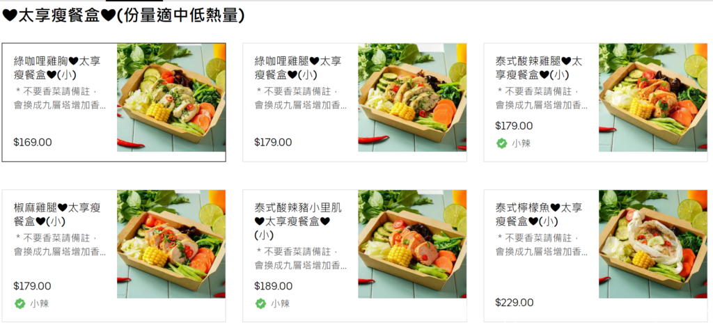 總共有綠咖哩雞胸、綠咖哩雞腿、泰式酸辣雞腿、椒麻雞腿、泰式酸辣小里肌、以及泰式檸檬魚等六種餐點。和一般泰式餐點比較不同的就是肉品是以舒肥烹調取代油炸。