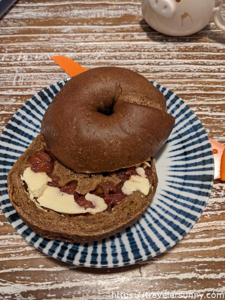 連吃了兩款貝果都讓桑妮意猶未竟,第三顆貝果一樣選了不常見的伯爵乳酪無花果貝果來開吃。