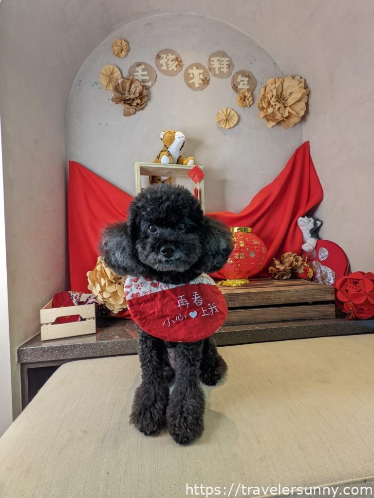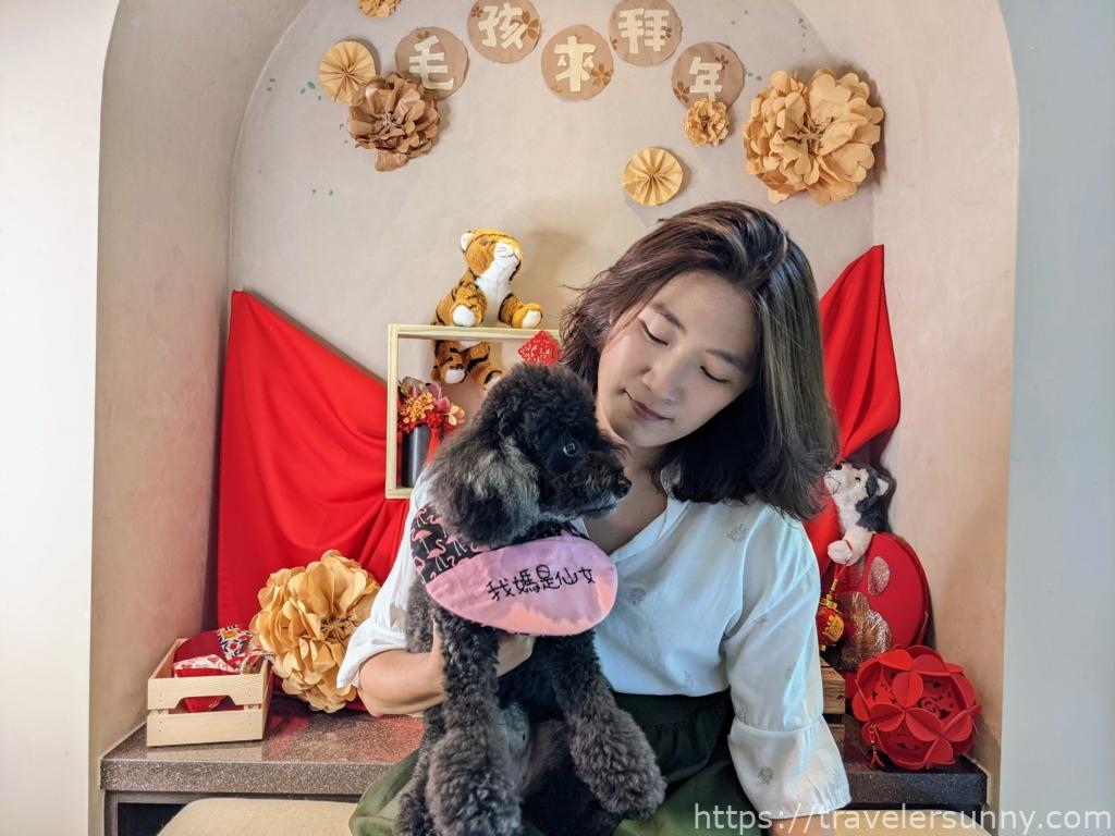 適逢過年期間,美容室外也有許多年節氣氛的裝飾品還有打卡用小圍兜兜,強迫歐嚕戴了一個『我媽是仙女』的圍兜,單純滿足媽咪自己的私心。而且你看看她,戴這個圍兜就很不配合看鏡頭,是在表達不同意的意思嗎?(⋟﹏⋞)