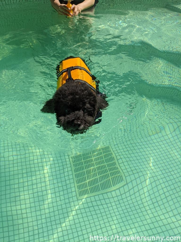 看看這個努力划水的小腳腳,重複幾次之後緊張感就比較下降了,家中毛孩要是第一次玩水的話也要記得讓它們以循序漸進的方式喔。也要歸功於多野樂泳池的包場制度,讓沒有很習慣有太多狗狗在身邊的歐嚕也可以專心在游泳這件事上,也因為有這個事前練習,過幾天我們到墾丁海邊時,歐嚕可是一點都不慌亂搖身一變成為水中蛟龍呢。