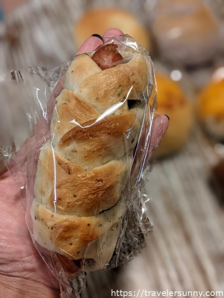 抖仔辣霸貝果形狀上和我們認知中圓形貝果不同,是呈長條型有點像大亨堡的感覺,以墨西哥辣椒、德式香腸和羅勒葉為主製成,口感上微辣,麵包體較為鬆軟,比較像是麵包的口感,不曉得是不是使用新鮮羅勒葉,香氣濃郁,當早餐吃最對味。