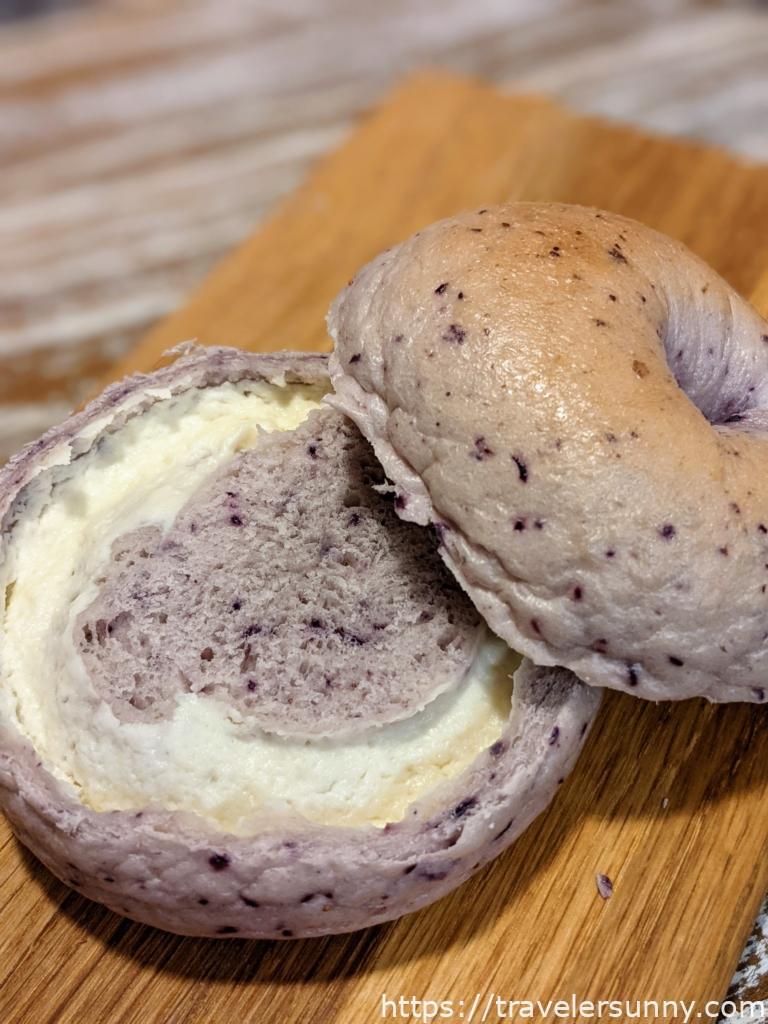 內容物有奶油乳酪、藍莓、日本上白糖,上白糖是日本獨有的一種砂糖種類,富濕潤感,用於烘焙會有較濕潤的口感。添加了許多新鮮藍莓製成,從外觀上看得到大量的藍莓果粒,圓潤的貝果表面帶有點水煮後的縐褶感。