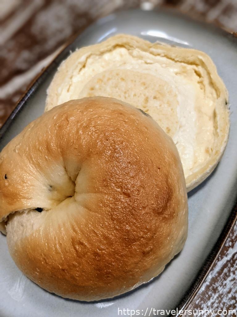 剖開橫切面,奶油乳酪依樣大方不手軟,原本以為這款貝果可能會比較酸,但其實是酸甜口感,有一種紐約起司蛋糕的感覺,酸酸甜甜好滋味。