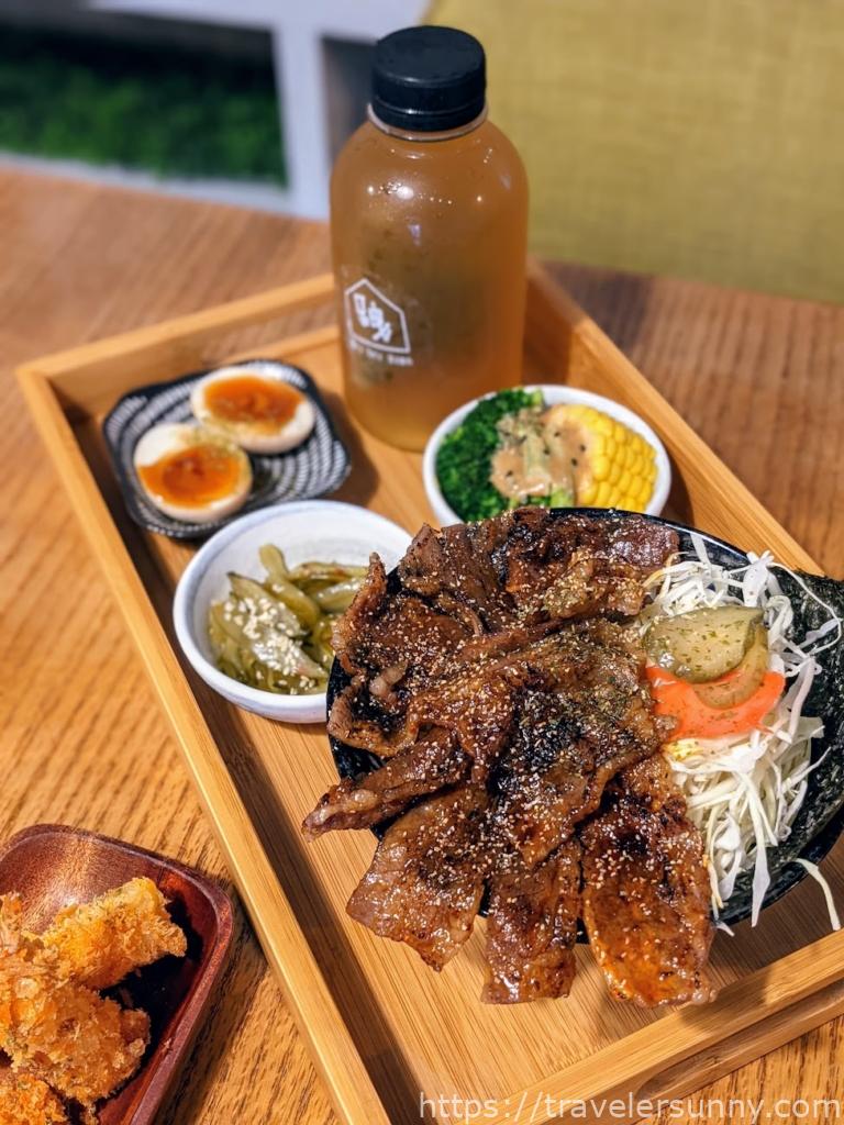 今天的附餐配菜分別是糖心蛋、海帶和胡麻青菜。個人覺得調味恰到好處,吃了較重口味的燒肉丼後,再配一口小菜,不知不覺就把飯吃光光了,是說份量對女生來說的話算滿多的喔。