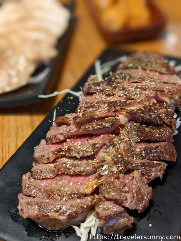美國嚴選沙朗牛排用大火香煎到恰當熟度,切開中心部位是漂亮的粉紅色還能不見血,需要有相當的功力去控制火侯,最後再刷上店家特製萬用醬汁後燒烤逼出牛脂香氣,口感呈現自然牛的香氣,不過乾也不過生,恰到好處的熟度好吃。