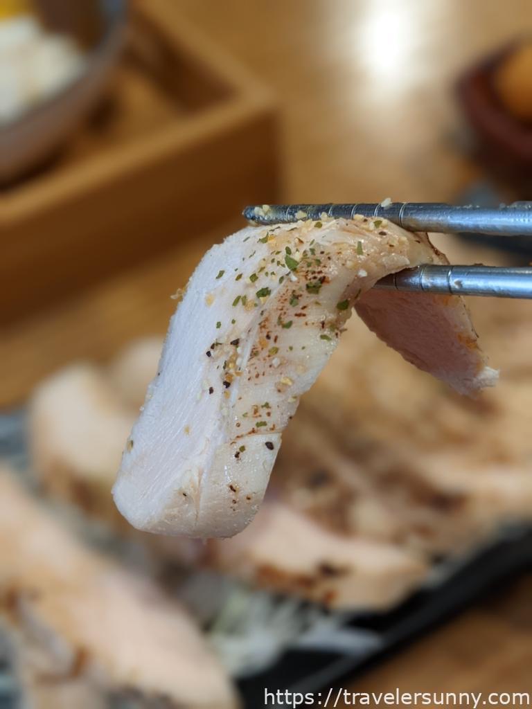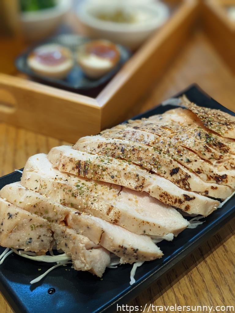 舒肥雞肉,是將雞肉在耐熱的真空袋中以長時間低溫的方式加熱,讓容易乾柴的雞胸肉維持在軟嫩的口感。調味方面只用簡單的鹽和胡椒,最後再淋上店家自製的萬用醬汁,低卡又美味。個人覺得很適合接下來夏天沒什麼胃口的時候,又或者在減肥、增肌減脂中的人享用。