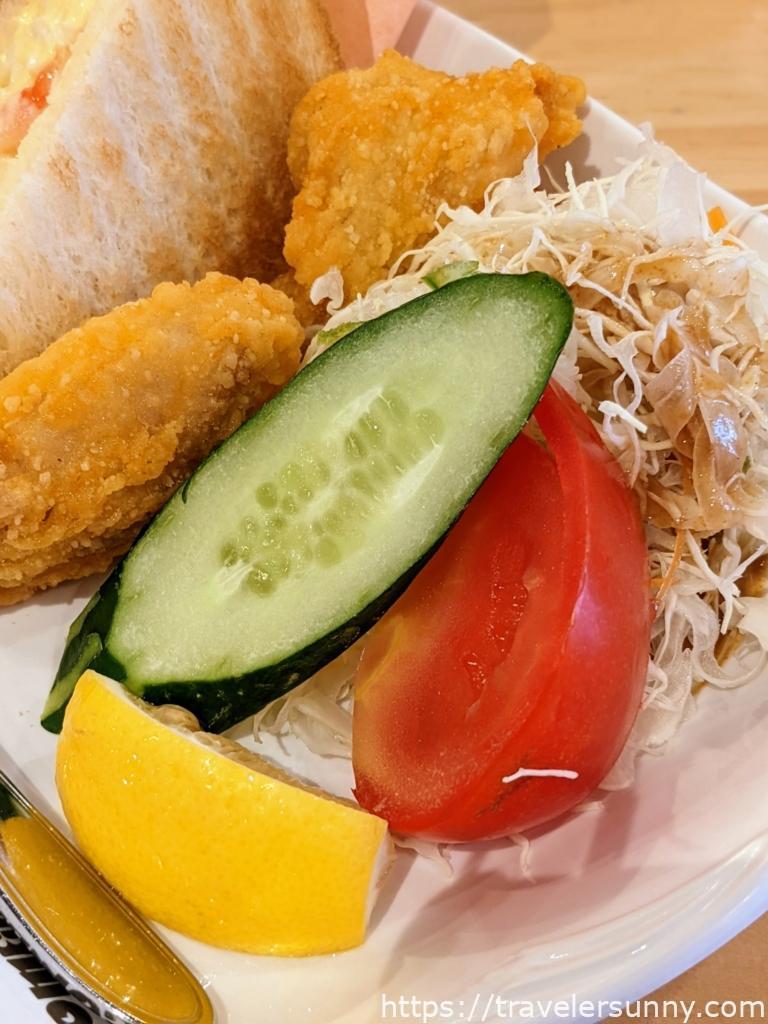 平日限定的商業午則是,在11:00~14:00點飲料加80元,就有雞蛋沙拉、紅豆鮮奶油三明治、和熱狗潛艇堡的超值套餐三選一。套餐內含主餐、6種蔬菜的沙拉、和炸雞塊兩塊。