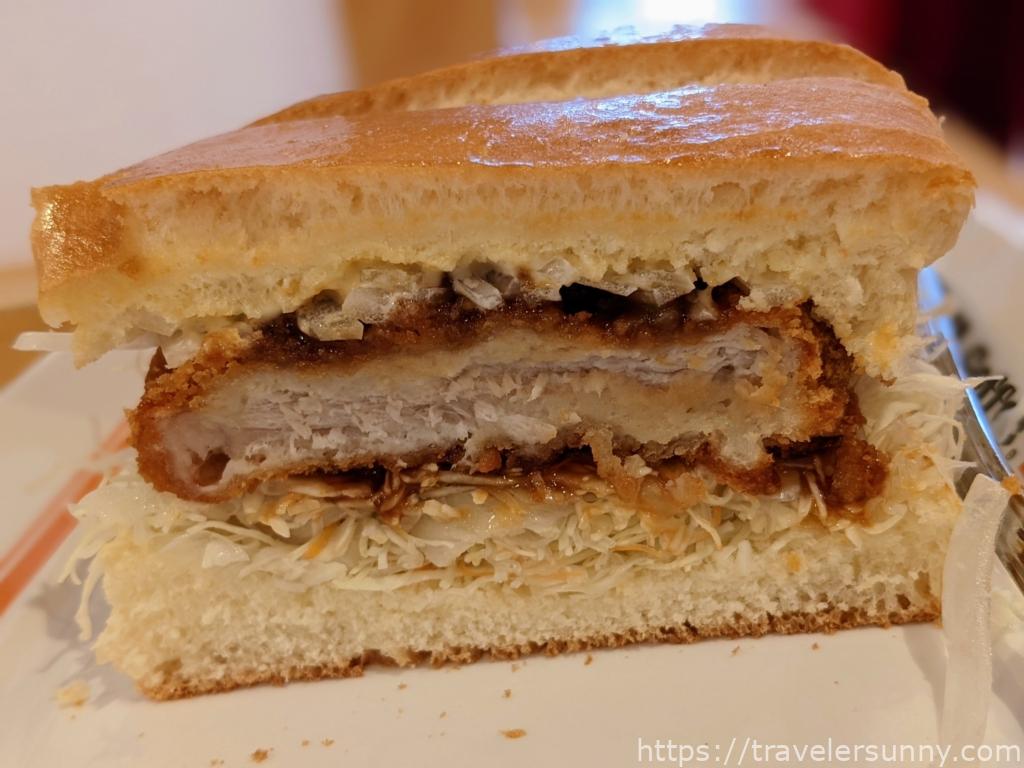 也因為分量實在是太扎實了,女生吃一個其實就頗有飽足感,三大塊還可以分成早餐午餐跟晚餐吃呢XD放涼後的豬排麵衣一樣酥脆美味,冷冷吃也好吃。