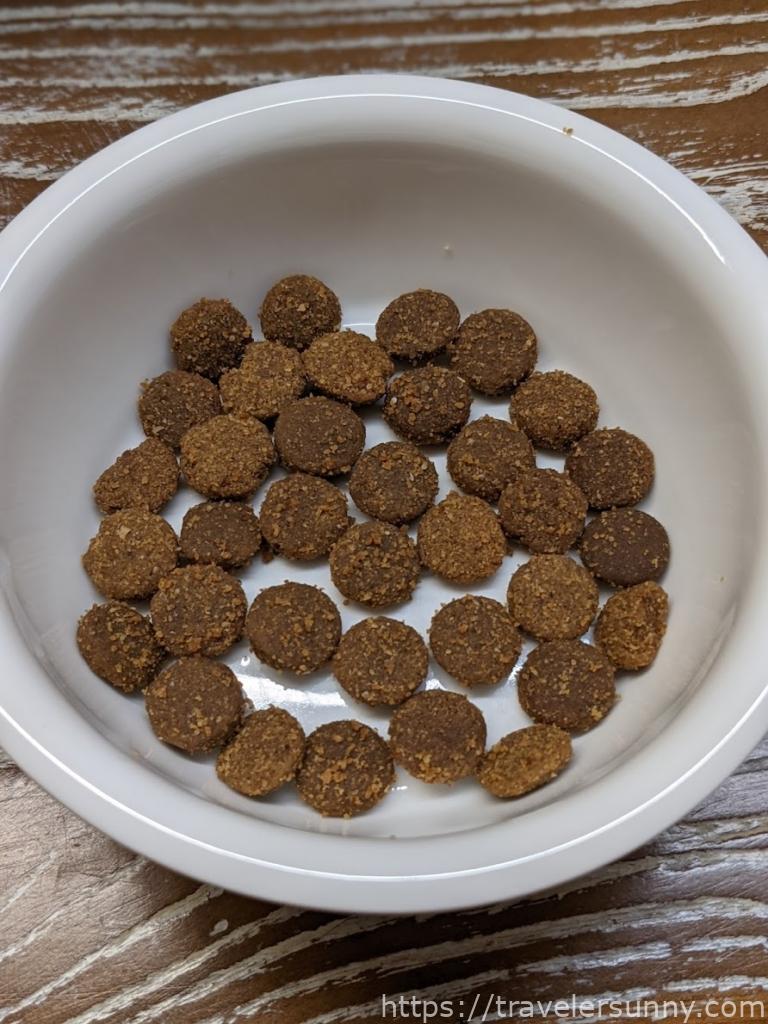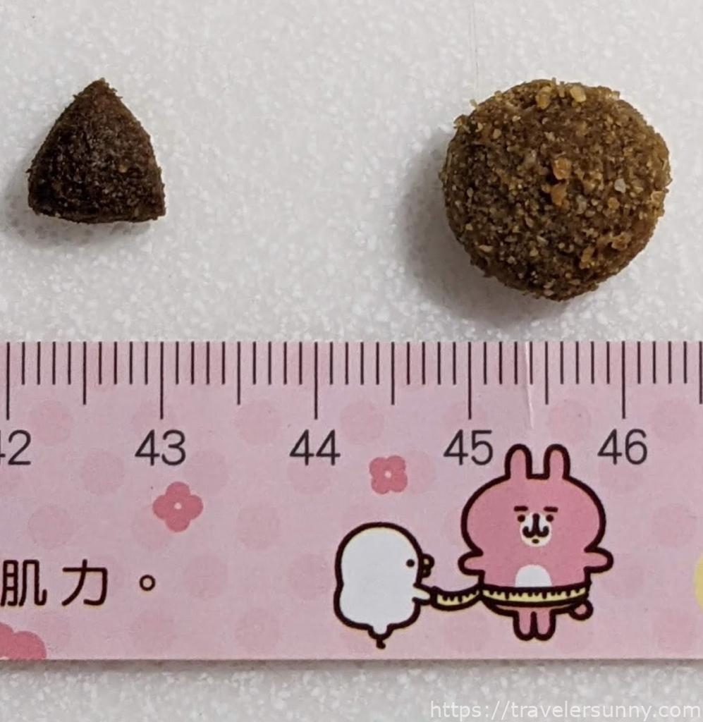 和她前一陣子吃的飼料相比起來有稍微大了一些些,直徑在1cm左右,對小型犬(4.3-4.7公斤左右)的歐嚕來說,到目前來說這個大小對於進食沒問題。