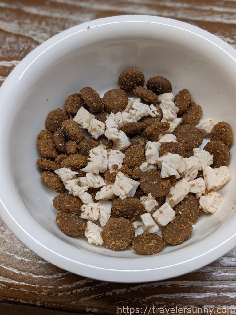 量好飼料的份量後,再幫她加入鮮食或凍乾粉,最近凍乾粉吃完了還沒補貨,就先用鮮食代替吧。接下來就讓歐嚕來試吃給大家看吧