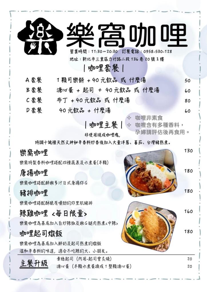 餐點的話選擇其實不多,總共只有五種選擇,不過這樣對於有選擇障礙的人非常友善(笑。分別是樂窩咖哩、唐揚雞咖哩、豬排咖哩、辣雞咖哩<每日限量>和咖哩起司燉飯。價格平實,最貴的也才180元,每一種主餐都可加價升級成套餐。套餐的話也有四種可選擇,非常的善解人意。