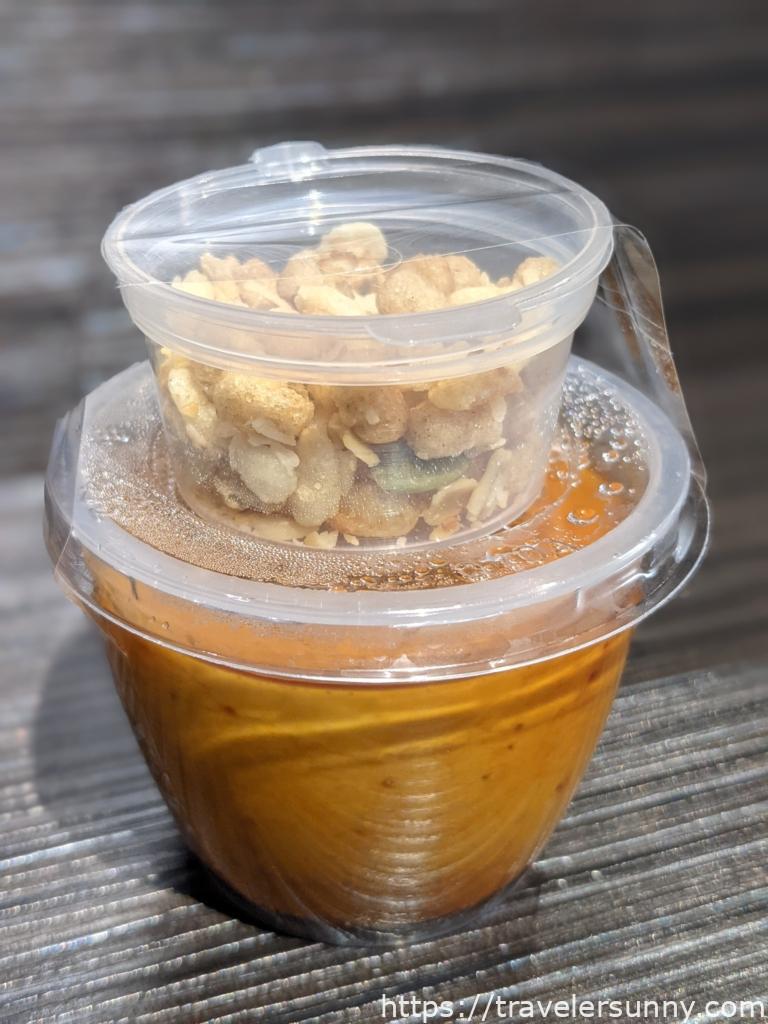 外帶的布丁會分成兩個容器裝,上方裝的是穀物麥片。
