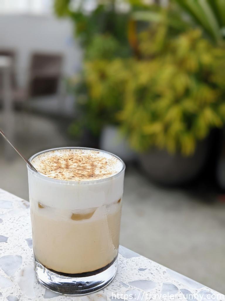 這杯海島黑糖拿鐵可是不含咖啡因的純牛奶喔。分層非常美,上層是細緻綿密的奶泡撒上黑糖,雖然黑糖拿鐵要喝熱的更能散發黑糖香氣,但冰的也好喝。下層黑糖牛奶恰到好處的甜度,讓人忍不住一口接著一口。