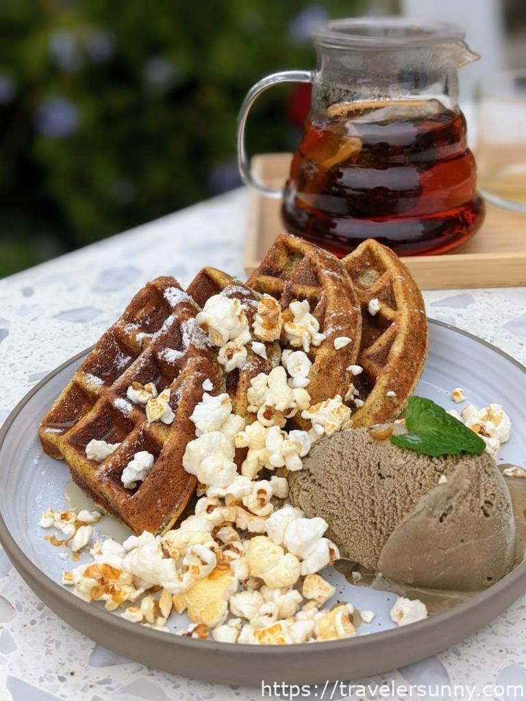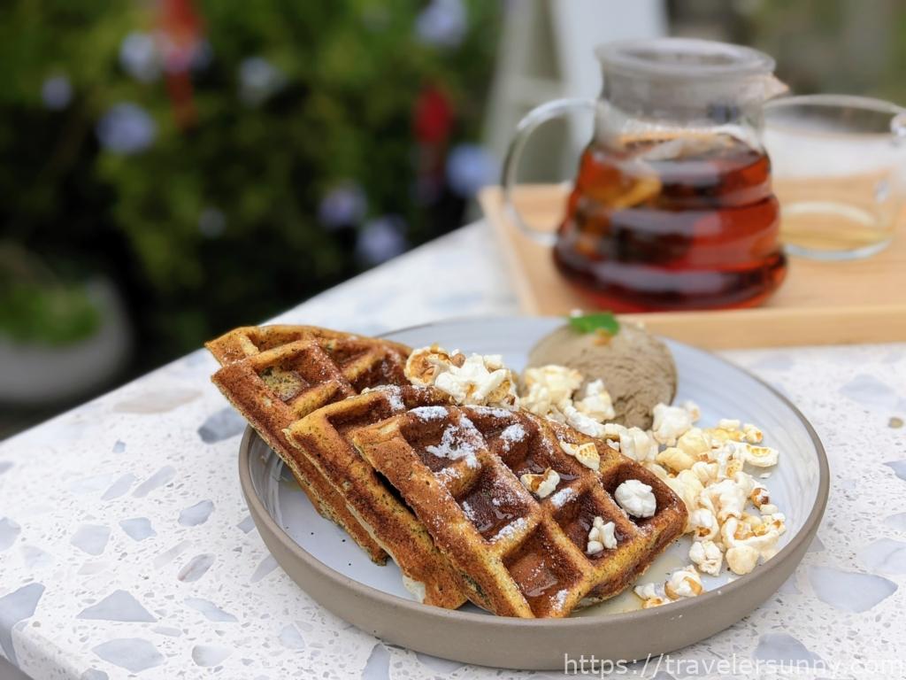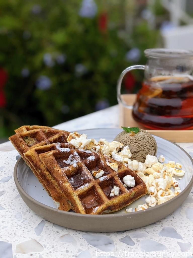 加入芝麻葉做成的鬆餅中間包裹著麻糬,入口茶香味四溢,爆米花並不是脆脆口感的爆米花,而是偏軟口感。