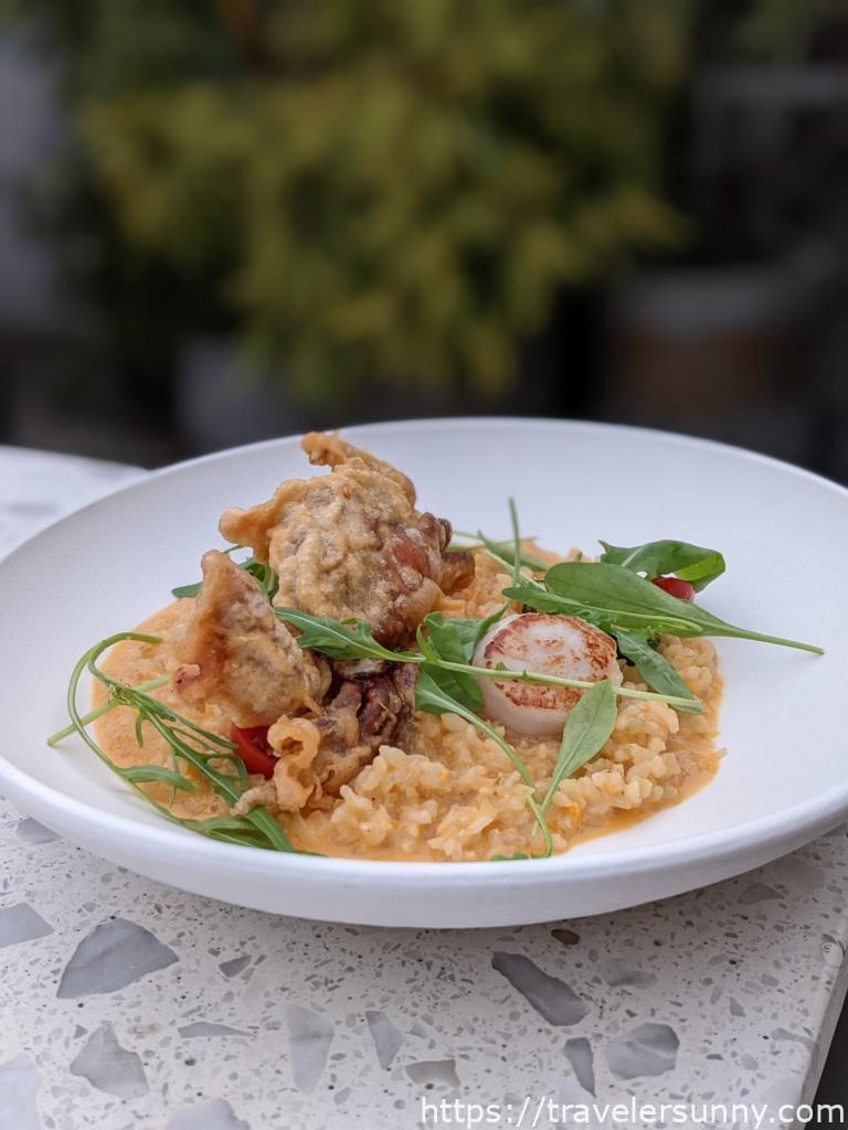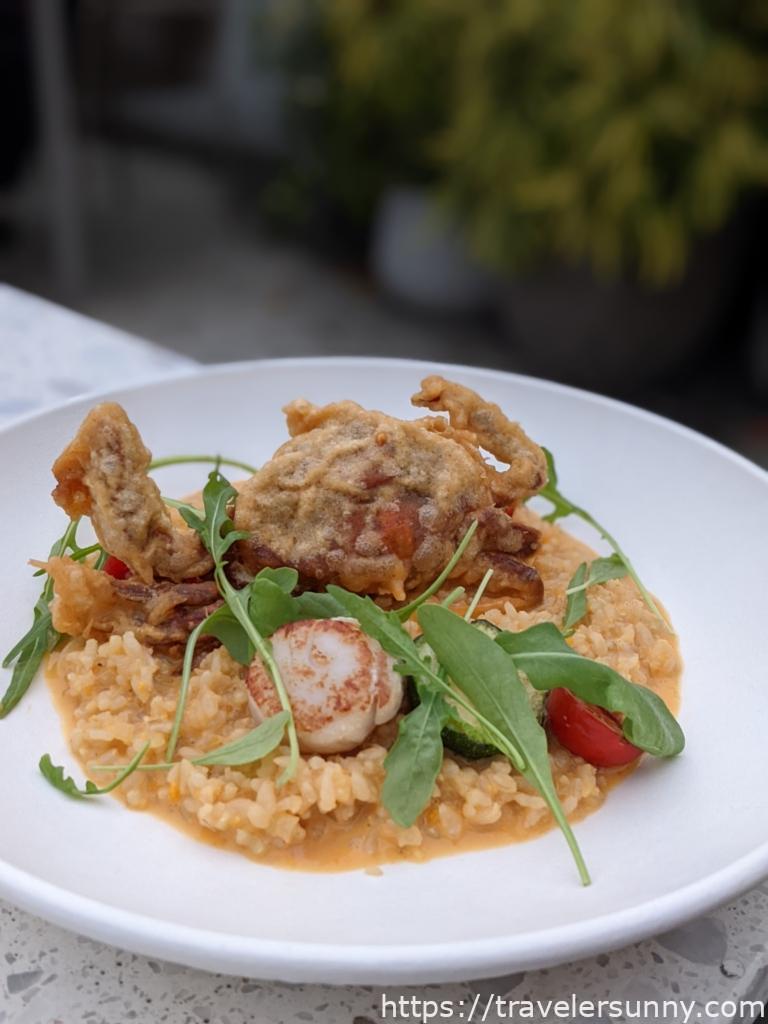 由於鬆餅給我們的感覺太良好,再加上不怎麼餓,就決定兩個人再點一到主食分食,晚餐一併解決了。點了菜單上感覺非常好吃又特別的海膽味噌海鮮燉飯。食材選擇上使用了酥炸軟殼蟹、北海道生食級干貝、自製海膽味噌醬。