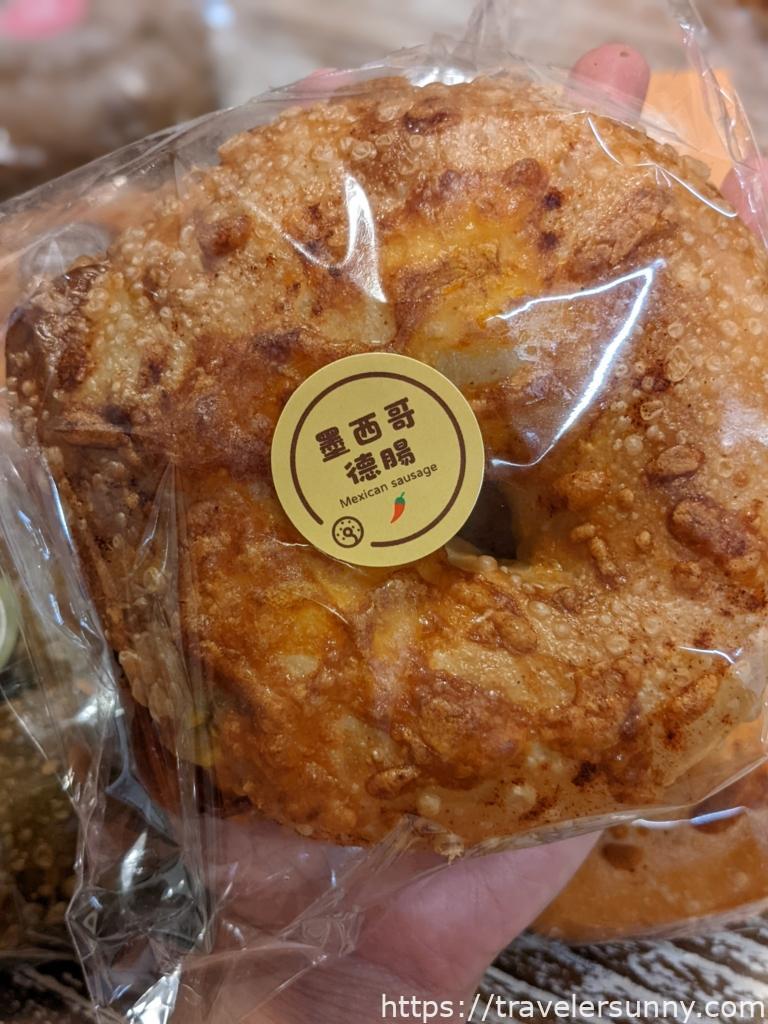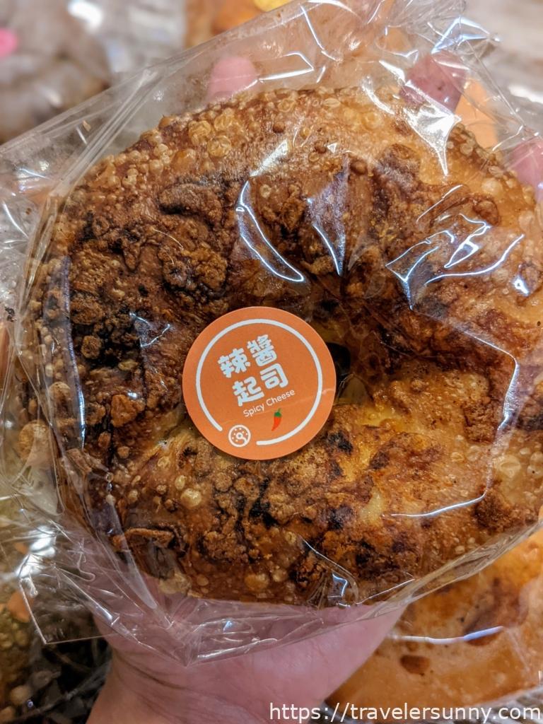 我把它切壞了!!!!!因此這顆貝果沒有斷面秀。起司放了滿多,每一口都能吃到德腸和濃濃起司,和墨西哥德腸不同,這款不會辣喔,推薦給不吃辣的人,個人還滿喜歡。