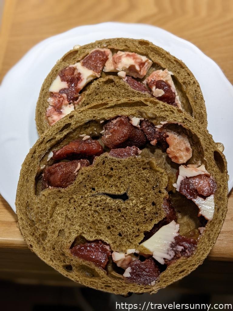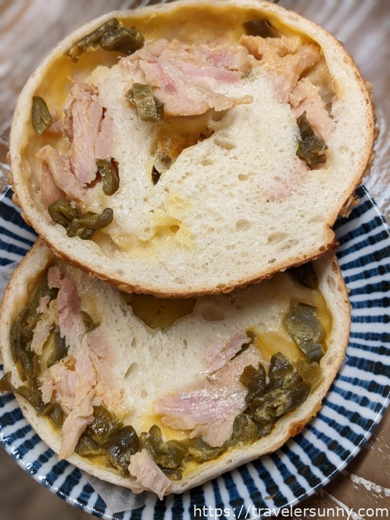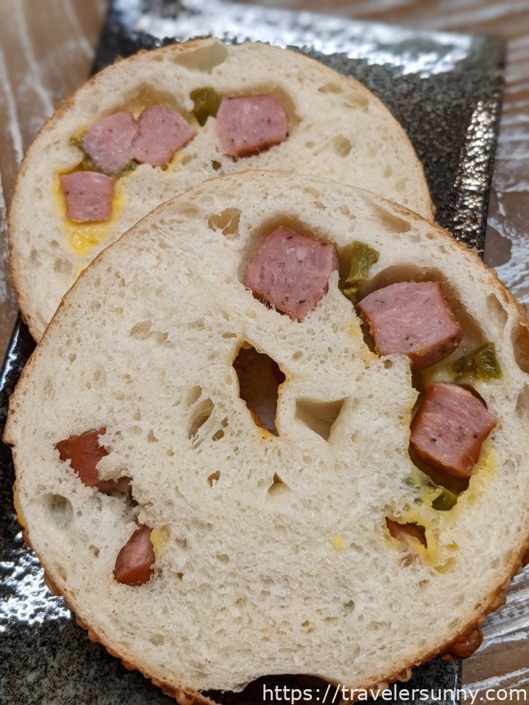 橫切後可看到一塊一塊的德式香腸以及墨西哥辣椒跟微微起司,這款貝果是真的會辣喔,平常愛吃辣的桑妮可感受到一些辣感,平常不吃辣的人可能要跳過比較好。貝果本身不會太油,好吃。嗜辣者推薦★★★★★